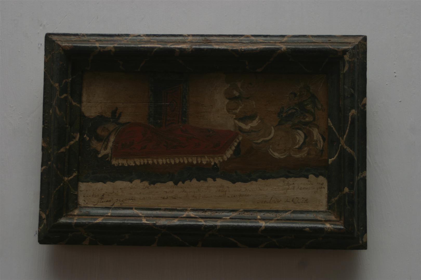 Ex-voto confeccionado em tábua de madeira, de formato retangular, com cena pintada a têmpera na parte frontal e em sentido horizontal. Pintura dividida em duas partes. Na parte superior, sob fundo branco e bege, à esquerda, cena com representação de enfermo feita através de figura masculina, deitada sobre leito em madeira escura, tendo a cabeça apoiada sobre travesseiro branco. Apresenta o corpo coberto por lençol branco e manta vermelha ornada por motivos fitomorfos, em tom marrom, e tendo barra com franjas brancas. Ao seu lado, sobre o piso marrom claro, escultura de santa em tom marrom escuro. Em segundo plano, representação de porta em tom marrom claro com ornatos em tom marrom escuro e portal em pintura marmorizada, nos tons azul claro e escuro. À direita da cena, sob fundo bege, representação de Nossa Senhora do Carmo feita através de figura feminina, jovem, sentada sobre nuvem nos tons marrom, bege e branco, estando ligeiramente de perfil, com a cabeça voltada à esquerda e encimada por raios de sol branco. Traja túnica de mangas compridas, em tom verde. Com seu braço direito segura o Menino Jesus, representado através de figura de criança desnuda, tendo corpo parcialmente coberto pela indumentária da Santa, a cabeça cercada por raios de sol brancos, e um escapulário em sua mão direita. No canto superior direito, representação de sol e raios brancos. Parte superior da cena separada da parte inferior através de friso horizontal ornado por motivos fitomorfos em tom azul claro e escuro. Parte inferior do objeto pintada de branco, contendo texto manuscrito como legenda, disposto em quatro linhas horizontais e em tinta preta: “Merce q fez N. Srª...grande mo/ lestia...não pode.../... pegouce/ No...rro de 1770” (data sublinhada). Objeto emoldurado por friso em meia-cana, tendo moldura escalonada pintada em marmorizado nos tons verde escuro, preto e branco. Verso do objeto em madeira lisa, contendo dois tarugos cilíndricos de madeira, dispostos nas extremidades da parte inferior da tábua.