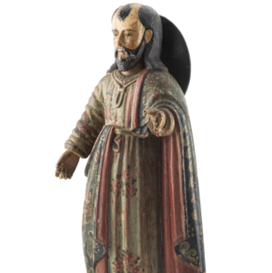 Figura masculina parcialmente ajoelhada — o joelho esquerdo toca o chão e a perna direita, bastante flexionada, provavelmente tenta erguer o corpo. Apresenta a cabeça, o olhar e o ombro muito voltados para a lateral direita; a mão direita se volta para baixo, próxima à região da genitália, e a mão esquerda ergue-se acima da cabeça: ambas provavelmente seguravam uma cruz. Usa barba e bigode e não tem cabelos, provavelmente usava peruca. Veste perizônio e apresenta chagas na face, no pescoço, peito, joelho e nas costas.