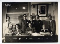Villa-Lobos sentado entre Arminda e Ruth Valladares Corrêa. De pé da direita para a esquerda, Iberê Gomes Grosso, Arnaldo Estrella, Gazzi de Sá, José Vieira Brandão e Oscar Borgerth